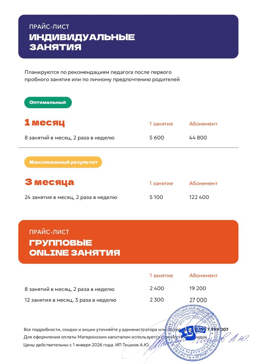 Начните с индивидуальных занятий, чтобы ребенок включился в ритм обучения. Затем мы советуем перейти на групповое обучение.